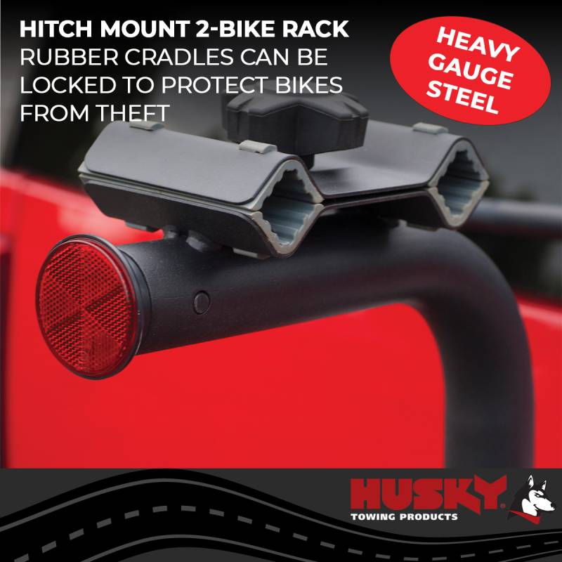 2" Receiver Mount Holds 2 Bikes Swing Away Frame Clamp Without Lock Non-Folding Husky Towing Products offers innovative designs, high quality, custom installation and safe, easy operation. Husky is source for a complete line of hitches, electrical products and towing accessories. Heavy Metal Design Powder Coated Finish Swivel Point Allows Access To The Trunk Or The Rear Door Of Your SUV Limited 1 Year Warranty