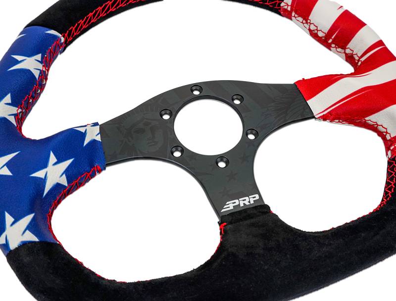 Add some MURICA vibes to your ride with PRP's Limited Edition New Glory D-Shaped Steering Wheel! Like all PRP Steering Wheels, these New Glory editions are Built for Off-Road. Constructed from high-strength aluminum, it can take the abuse of racing rock crawling or flying across the desert. The steering wheel has a 6-point bolt pattern, specifically chosen because it fits most aftermarket hubs and quick releases. Customize the look of your New Glory Steering Wheel by adding on one of PRP's New Glory Stars and Stripes or New Glory Shadow Center Caps. Features: Made from high strength aluminum - tested at 500lbs to first deflection 6 Point Bolt Pattern - Most common in off-road industry quick release adapters. Durable and moisture resistant High-Quality Suede and Leather Grip Measurements: Diameter – 13 inches Weight – 2 lbs Dish depth – 3 inches Bolt Pattern Measurement - 2.75"