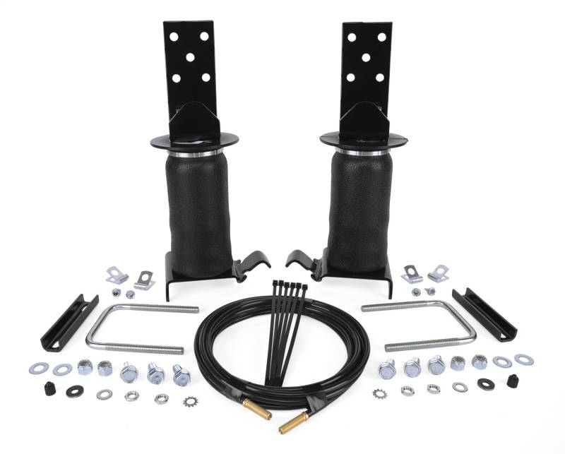 RIDE CONTROL KIT RideControl provides more safety, stability and ride comfort. The kit fits many popular vehicles with leaf springs, including half-ton and mini pickups, full-size and mini vans, and SUVs. Both front and rear applications are available for these vehicles. Each kit includes everything you need, and is easily installed in two hours or less. End caps are made of an ultra-strong nylon composite that is as strong as steel, but weighs less and is corrosion-proof. Air Lift RideControl adjustable air springs work with your existing leaf spring suspension. Just add air when towing or hauling a heavy load, and reduce air pressure when unloaded, the air bags are fully adjustable for a great ride. Air Lift air springs eliminate sag, sway, and bottoming out. Each kit includes everything you need, and is easily installed in two hours or less. These rugged, durable components mean that you get reliable service from the springs for the lifetime of the vehicle. Air Lift RideControl air helper springs are air-adjustable from 5 to 100 PSI and have up to 2,000 pounds of leveling capacity, right up to the manufacturer's recommended Gross Vehicle Weight Rating. They also come with a limited lifetime warranty and an exclusive 60-day ride satisfaction guarantee. Fully adjustable air springs are designed to level your vehicle when towing or hauling a heavy load, giving you a safe comfortable ride Eliminate sag and bottoming out Components are rugged and durable, including air springs and all hardware Easy to install with fully-illustrated installation manual Up to 2,000 lbs. of load-leveling capacity (Note: Do not exceed vehicle's GVWR)