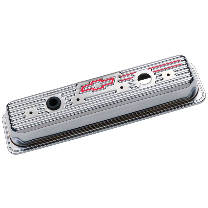 Engine Valve Covers These CHEVROLET Bowtie valve covers are made of heavy-gauge steel, 20% thicker than typical aftermarket valve covers, greatly reducing the likelihood of leakage around the valve cover flange area caused by fasteners being over-torqued. The chrome plating meets GM quality specifications. All valve covers bear the powerful Bowtie and CHEVROLET Emblems. These stamped valve covers are offered in production height (short). Oil restricting baffles are offered in these valve covers for those who wish to maintain the PCV hookup. All valve covers are sold in pairs, equipped with air breather and PCV grommets, unless specified otherwise. Technical Note: Production height Chevy small-block valve covers and valve covers with baffles will not clear most stud girdle applications. Fits Chevy small-block engines 1987 to current.