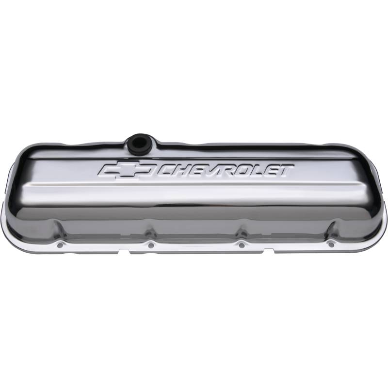 Engine Valve Covers These CHEVROLET Bowtie valve covers are made of heavy-gauge steel, 20% thicker than typical aftermarket valve covers, greatly reducing the likelihood of leakage around the valve cover flange area caused by fasteners being over-torqued. The chrome plating meets GM quality specifications. All valve covers bear the powerful Bowtie and CHEVROLET Emblems. Stamped valve covers are offered in either tall or production height (short). Oil restricting baffles are offered in many valve covers for those who wish to maintain the PCV hookup. All valve covers are sold in pairs, equipped with air breather and PCV grommets, unless specified otherwise. Chevy big-block or B/B refers to 1965-1996 engines.