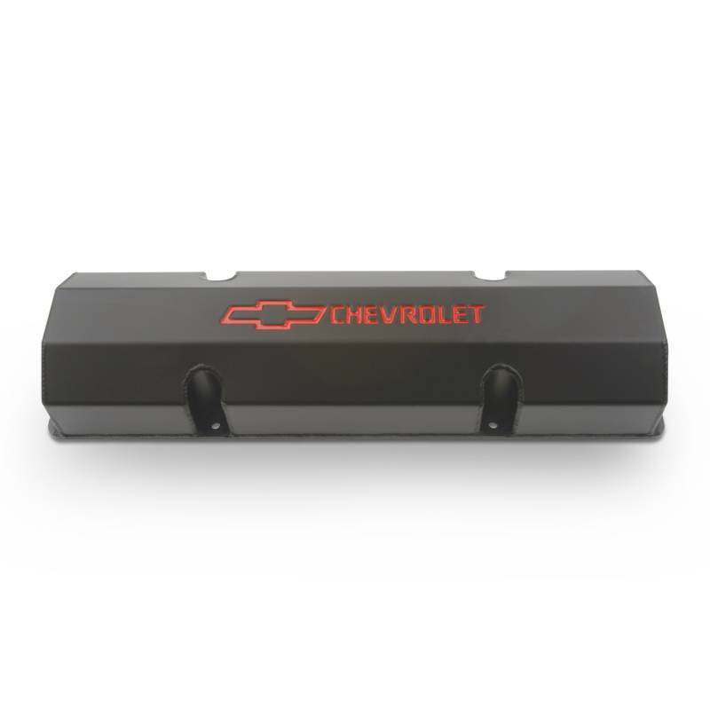 Engine Valve Covers These precision welded fabricated aluminum valve covers are for the serious racer. No holes or baffles for a closed system. Two covers per box. They have recessed Bowtie and CHEVROLET Emblems, inlaid with classic Chevrolet red, billet mounting rails for maximum leak resistance, and weigh less than 4 lbs, 45% less than other materials! Get'em before they're gone because these are closeout items!