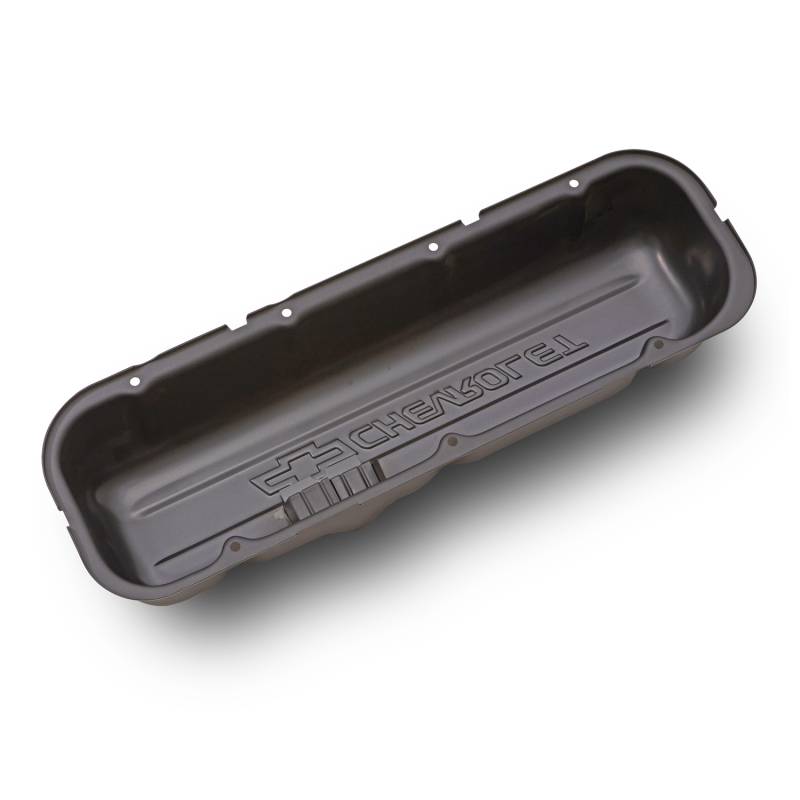 Engine Valve Covers These CHEVROLET Bowtie valve covers are made of heavy-gauge steel, 20% thicker than typical aftermarket valve covers, greatly reducing the likelihood of leakage around the valve cover flange area caused by fasteners being over-torqued. All valve covers bear the powerful Bowtie and CHEVROLET Emblems. Stamped valve covers are offered in either tall or production height (short). Oil restricting baffles are offered in many valve covers for those who wish to maintain the PCV hookup. All valve covers are sold in pairs, equipped with air breather and PCV grommets, unless specified otherwise. Technical Note: Production height valve covers and valve covers with baffles will not clear most stud girdle applications. Chevy big-block or B/B refers to 1965-1996 engines.