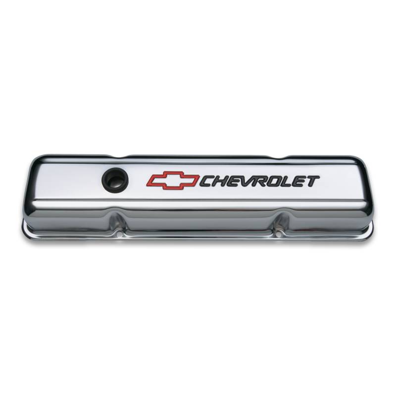 Engine Valve Covers The Latest Look for Chevrolet Small-block V8, 1958-1986. These CHEVROLET Bowtie valve covers are made of heavy-gauge steel, 20% thicker than typical aftermarket valve covers, greatly reducing the likelihood of leakage around the valve cover flange area caused by fasteners being over-torqued. The chrome plating meets GM quality specifications. All valve covers bear the powerful Bowtie and CHEVROLET Emblems. Stamped valve covers are offered in either tall or production height (short). Oil restricting baffles are offered in many valve covers for those who wish to maintain the PCV hookup. All valve covers are sold in pairs, equipped with air breather and PCV grommets, unless specified otherwise. Technical Note: Production height Chevy small-block valve covers and valve covers with baffles will not clear most stud girdle applications. Chevy small-block or S/B refers to 1958-1986 engines, unless otherwise specified.