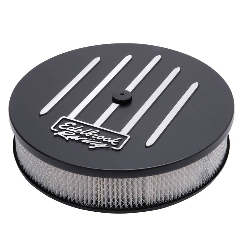 The new Racing Series #41663 is the latest addition to our line of engine dress-up accessories. Made from heavy-gauge, die-cast aluminum, these valve covers feature a sleek flat black powder coated finish with diamond cut finish raised racing stripe and Edelbrock Racing logo. The modern high-tech look will give any engine an aggressive look to match it's performance. Racing Series air cleaners feature a Pro-Flo Universal Air Filter with the exclusive Pro-Charge clean strip for easy maintenance. Each filter is washable and reusable. Fits all popular 5-1/8" diameter carburetors and includes a black anodized knurled nut. Comes with high-quality 3" pre-oiled and washable filter for excellent filtration.