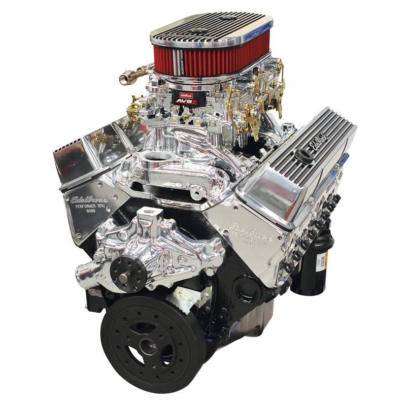 Edelbrock part #45014 Performer small-block Chevy 350 Dual Quad crate engine offers the best of quality and performance with 315 HP & 372 ft/lbs. of torque right out of the crate. This small-block Chevy 350 crate engine is ideal for any street rod, muscle car or truck owner looking for 300+ hp performance on 87-octane fuel. Performer crate engines are 100% brand new and include a 4-bolt main block, Edelbrock Performer heads, hydraulic camshaft, roller rocker arms, RPM Air-Gap Dual-Quad intake manifold with AVS2 500 cfm carbs and short water pump. Specifications: - Finish: EnduraShine - Displacement: 350 c.i.d. - Horsepower: 315 hp - Torque: 372 ft-lbs. - Compression: 9.0:1 - Block: New 4-bolt main w/ 2-piece rear main seal - Crankshaft: Cast Iron - Pistons: Cast Aluminum - Camshaft: Performer #2102 - Rocker Arms: 1.5:1 Roller - Manifold: RPM Air-Gap #75254 - Cylinder Heads: Performer RPM #608919 - Carburetor: AVS2 500 cfm carbs - Water Pump: Short Style Water Pump #88104 - Distributor: Included - Valve Covers: Elite II Series - Warranty: 2-year / Unlimited mileage