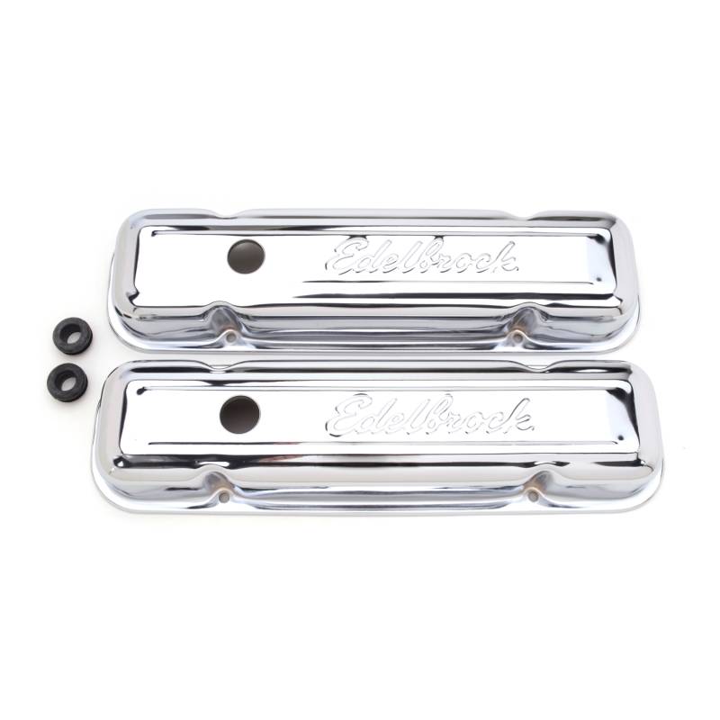 Signature Series Valve Covers, Chrome, Low Profile, Pontiac 301-455 V8, '62-'79 The Edelbrock #4456 Signature Series Valve Covers are designed for Pontiac 301-326-350-389-400-421-455 V8 - '62-79 applications. Engineered for function and styled for great looks, Signature Series valve covers have stock-style breather baffles that prevent oil passage to the PCV valve. These quality valve covers accept all emissions equipment, including PCV valve holes. Rubber grommets for the breather and PCV valve holes are included. Matching breathers sold separately.