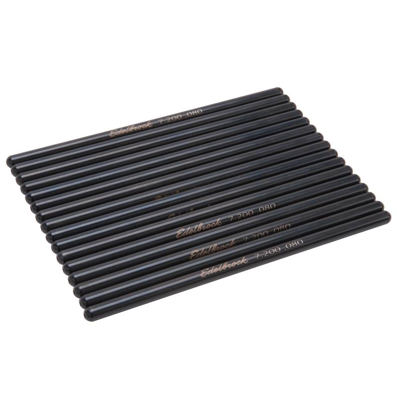 Edelbrock part #9653 Pushrods are designed for Chevy 348/409 "W" series V-8 engine applications. These one-piece pushrods are manufactured from high quality 4130 Chromoly steel tubing that has been surface hardened for maximum durability. They have precise formed wedged ends for a high quality fit with the cup seats. A black oxide finish is added for corrosion resistance. Pushrod Specifications: - For hydraulic roller lifters - Outside Diameter: 5/16" - Length: 7.200"