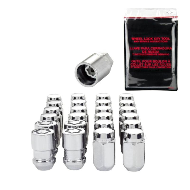 Cone Seat Exposed Style Wheel Installation Kit-Chrome The convenient way to order wheel locks and lug nuts; Contains all the hardware that you need to install 4 wheels and tires.; McGard manufactures wheel locks and lug nuts in the USA to meet or exceed O.E.M. standards for safety and durability.; Presently, McGard is an Original Equipment wheel lock supplier to most automobile brands around the world.; These easy-to-use, one-piece wheel locks function like regular lug nuts, but require a special key tool for installation and removal.; The computer generated key designs allow for an infinite number of key patterns.; McGard lug nuts are guaranteed for life not to rust, chip or peel.; Designed and built for the real world. Think about it, harsh elements, nasty corrosive wheel cleaners, overzealous impact guns, loose fitting lug wrenches and lead-foot drivers. This kind of treatment destroys ordinary lug nuts.; McGard lug nuts can take the punishment and keep your wheels looking beautiful.; Every McGard wheel lock and lug nut is fully machined from restricted chemistry steel made specifically for McGard and through-hardened for its unsurpassed level of security and safety.; For use with steel or aluminum wheels with exposed decorative lug nuts that are tapered at the bottom. This product may contain globally sourced materials/components.