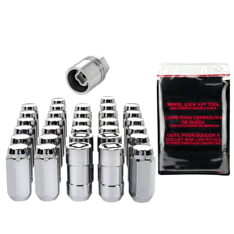 Cone Seat Exposed Style Wheel Installation Kit-Chrome The convenient way to order wheel locks and lug nuts; Contains all the hardware that you need to install 4 wheels and tires.; McGard manufactures wheel locks and lug nuts in the USA to meet or exceed O.E.M. standards for safety and durability.; Presently, McGard is an Original Equipment wheel lock supplier to most automobile brands around the world.; These easy-to-use, one-piece wheel locks function like regular lug nuts, but require a special key tool for installation and removal.; The computer generated key designs allow for an infinite number of key patterns.; McGard lug nuts are guaranteed for life not to rust, chip or peel.; Designed and built for the real world. Think about it, harsh elements, nasty corrosive wheel cleaners, overzealous impact guns, loose fitting lug wrenches and lead-foot drivers. This kind of treatment destroys ordinary lug nuts.; McGard lug nuts can take the punishment and keep your wheels looking beautiful.; Every McGard wheel lock and lug nut is fully machined from restricted chemistry steel made specifically for McGard and through-hardened for its unsurpassed level of security and safety.; For use with steel or aluminum wheels with exposed decorative lug nuts that are tapered at the bottom. This product may contain globally sourced materials/components.