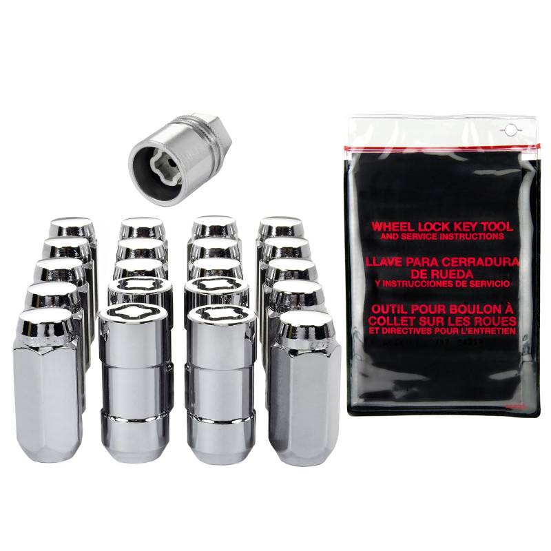 Cone Seat Exposed Style Wheel Installation Kit-Chrome The convenient way to order wheel locks and lug nuts; Contains all the hardware that you need to install 4 wheels and tires.; McGard manufactures wheel locks and lug nuts in the USA to meet or exceed O.E.M. standards for safety and durability.; Presently, McGard is an Original Equipment wheel lock supplier to most automobile brands around the world.; These easy-to-use, one-piece wheel locks function like regular lug nuts, but require a special key tool for installation and removal.; The computer generated key designs allow for an infinite number of key patterns.; McGard lug nuts are guaranteed for life not to rust, chip or peel.; Designed and built for the real world. Think about it, harsh elements, nasty corrosive wheel cleaners, overzealous impact guns, loose fitting lug wrenches and lead-foot drivers. This kind of treatment destroys ordinary lug nuts.; McGard lug nuts can take the punishment and keep your wheels looking beautiful.; Every McGard wheel lock and lug nut is fully machined from restricted chemistry steel made specifically for McGard and through-hardened for its unsurpassed level of security and safety.; For use with steel or aluminum wheels with exposed decorative lug nuts that are tapered at the bottom. This product may contain globally sourced materials/components.