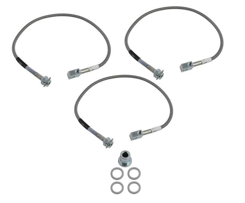 1982-86 Jeep CJ5/Cj7/CJ8 With 4" Lift (Front Disc, Rear Drum) 3 Lines Russell's wide variety of lightweight aluminum adapter fittings allow for the connection of Russell hose ends to almost any component. Adapters are offered in standard thread, metric thread and pipe thread to fit most popular oil pumps, fuel pumps, fuel filters plus a variety of other common components. To compliment the looks of the hose installation, three finishes are available - ultra-bright Endura, traditional blue anodized or our new black anodized fittings. Legal In All 50 States Meets DOT Guidelines And Requirements Pre-Assembled Stainless Steel Braided Hose Zinc Plated Fittings
