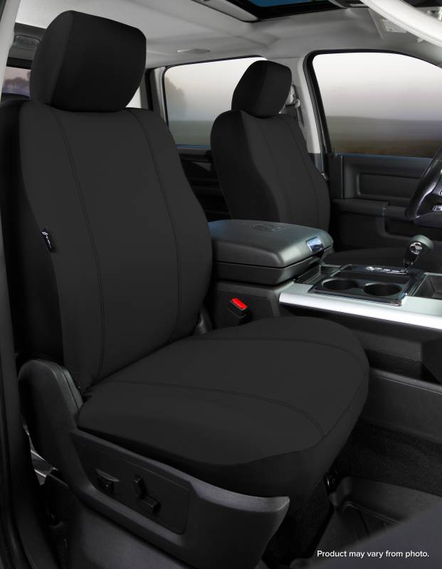SP80 Series - Seat Protector Polyester Custom Fit Front Seat Cover - Black SP80 Series Seat Protector custom fit seat covers are engineered for the ultimate in seat protection for heavy commercial use. An advanced design creates a dynamic state-of-the-art custom interior. On vehicle testing of all Fia custom fit seat covers ensures an exact fit each time. Super- Grip is the slip resistent fastening system that incorporates quick release belt and buckle fasteners, zippers and velcro, making installation quick and easy. The form fit wrap around design that is accomplished through multi-directional stretch trim material molds the cover to the contours of your seat. The commercial grade double stitched polyester material is hand washable as well as lightfast and colorfast. Custom formed seat belt and head rest openings, along with center console covers add to the original equipment custom look. Head rest covers included. Available in Black, Gray and Taupe. State-of-the-Art Custom Interior Advanced Design Super-Grip Technology Quick and Easy Installation Wear Resistant Fabrics