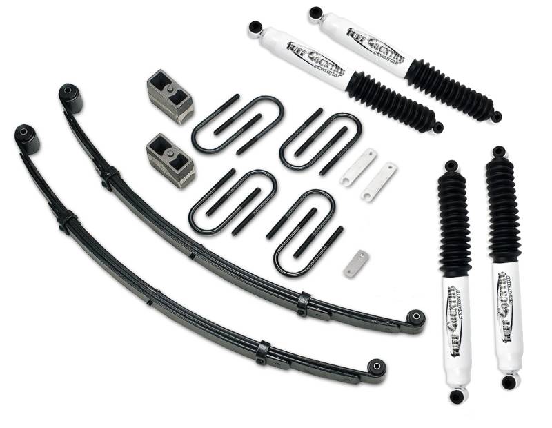 - Includes: 2) Heavy Duty front leafs springs, 2) 3 Inch Cast Iron blocks, 4) Front U-bolts, 4) Rear U-bolts, 1) Brake line extension kit, Hardware bag, 4) Spring eye bolts, 4) SX8000 Shocks