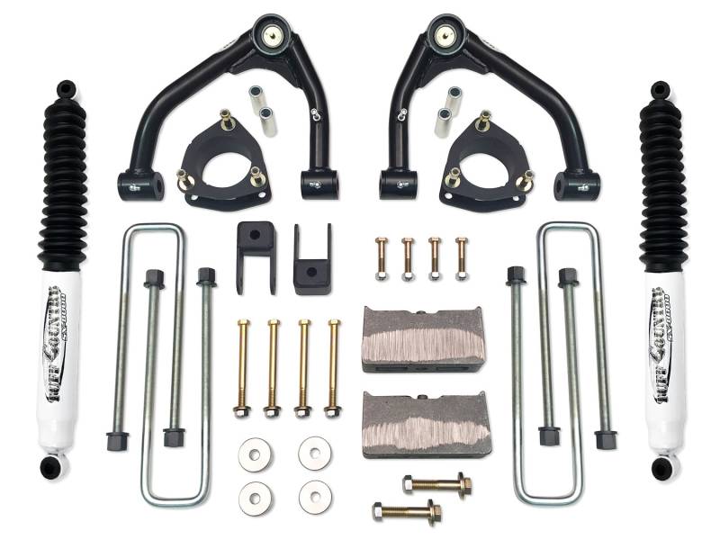 Tuff Country 4 inch suspension lift kit for the Silverado/Sierra 1500 is designed to make lifting your vehicle simple and affordable. This easy to install suspension lift kit uses new tubular control arms (with poly bushings) and upper strut spacers to lift the front of your Silverado/Sierra 1500 3 inch and cast iron rear block with extended u-bolts lift the rear 2 inches (removes 1 inch factory block). Also included are differential drops. New struts or shocks are not required (rear shock relocating brackets included).