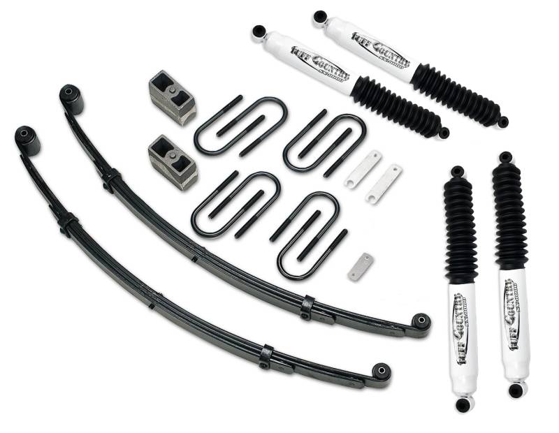 - Includes: 2) EZ-Ride front leaf springs, 2) 3 inch rear cast iron blocks, 4) Front U-bolts, 4) Rear U-bolts, 1) Brake line extension kit, 2) Hardware bag, 4) Front leaf spring eye bolts, 4) SX8000 Shocks