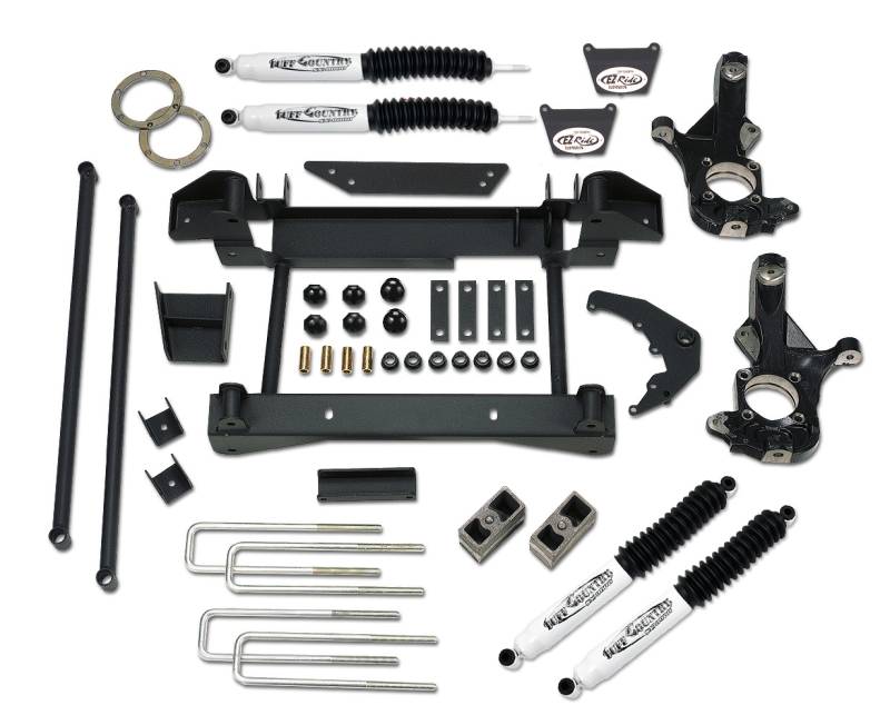 Gain additional tire clearance to fit 35 inch tires and a cool new look with this Tuff Country Silverado/Sierra 1500HD 6 inch lift kit. This lift kit uses a combination of new extended steering knuckles and a one-piece sub-frame to lift the front end. 4 inch cast iron blocks along with rear add-a-leafs lift the rear to level the Silverado/Sierra.