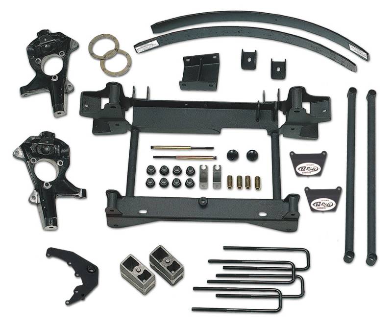 - Includes: 1) One piece sub-frame, 2) Steering knuckles, 2) Differential drop brackets, 2) Torsion bar drop brackets, 2) Axle spacers, 4) U-bolts, 2) Rear 4 inch cast iron lift blocks, 2) Rear add-a-leafs, 1) Brakeline relocating kit, 2) Lateral compression arms and mounts and required hardware