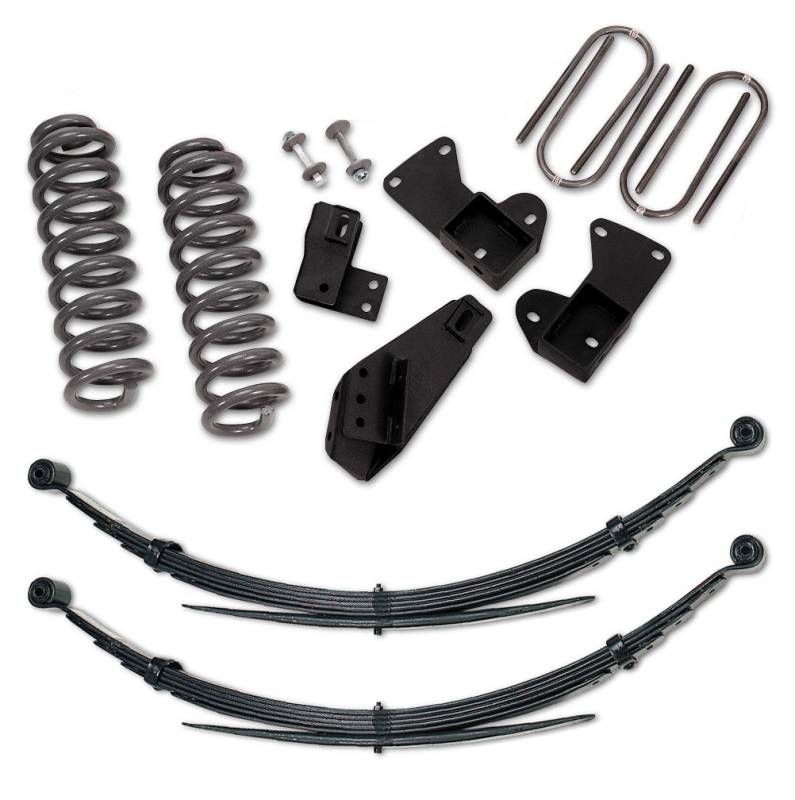 - Includes: 2) Coil Springs (EZ-Ride), 2) Axle Pivot Brackets (w/cam-bolts), 2) Radius Arm Drop Brackets, 4) Rear U-bolts, 2) Rear Leaf Springs, 1) Hardware Bag