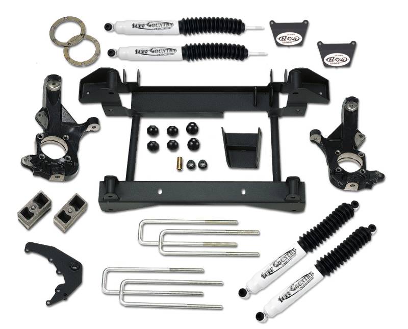 Gain additional clearance to fit 33 inch tires and a cool new look with this Tuff Country Silverado/Sierra HD 4 inch lift kit. Using a combination of new extended steering knuckles and a one-piece sub-frame to lift the front end. 2 inch cast iron blocks lift the rear to level with the front.