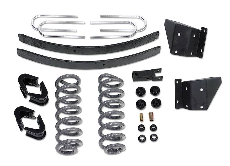 - Includes: 2) Coil Springs (EZ-Ride), 2) Radius Arm Drop Brackets, 1) Track Bar Relocating Bracket, 1) Front and Rear Brake Line Extension Kit, 4) Rear U-bolts, 2) Rear Add-a-Leafs, 1) Hardware Bag, 4) C-Bushings (4 degree), 4) Radius Arm Bushings, 4) Track Bar Bushings and Sleeves