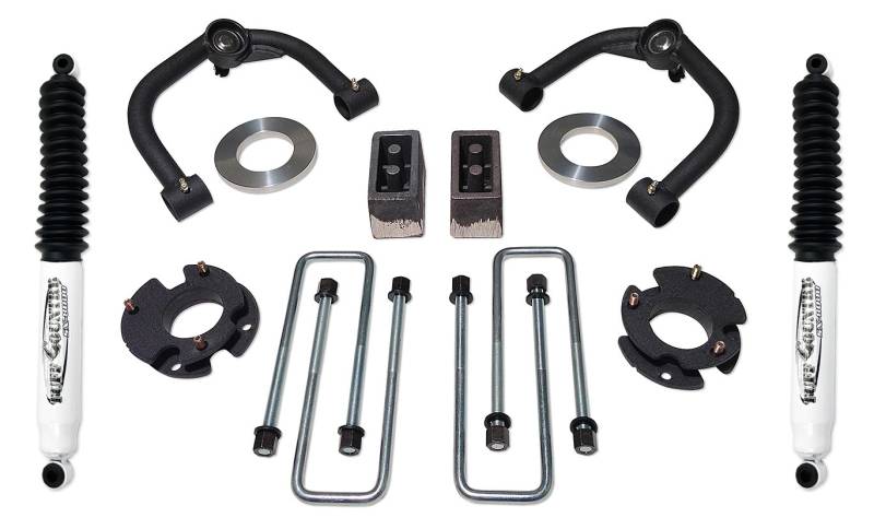 Get your F150 in the air with this easy to install, high quality suspension lift. Tuff Country's 3 inch lift kit for the Ford F150 will allow you to fit up to 35 inch x 11.5 inch tires (with minor trimming) while keeping a factory ride. A combination of upper coil/strut spacers and upper control arms are used to lift the front 3 inches.