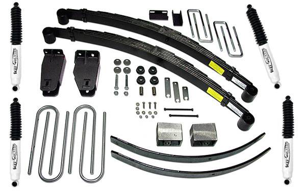 - Includes: 2) Front leaf springs (w/poly bushings), 2) Axle Pivot Brackets (w/cam bolts), 2) 4 inch Cast Iron Rear Blocks (replaces factory blocks), 1) Drop Pitman Arm (not shown in image) 2) Front Sway Bar Drop Brackets, 4) Front U-bolts, 4) Rear U-bolts, 2) Front Brake Line Extension Brackets, 1) Rear Brake Line Extension Bracket, 1) Hardware Bag, 4) Poly Shackle Bushings, 4) SX8000 Shocks