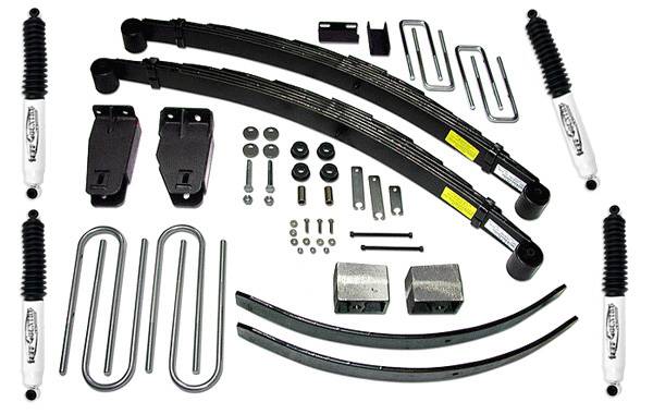 - Includes: 2) Front leaf springs (w/poly bushings), 2) Axle Pivot Brackets (w/cam bolts), 2) 4 inch Cast Iron Rear Blocks (replaces factory blocks), 2) Front Sway Bar Drop Brackets, 4) Front U-bolts, 4) Rear U-bolts, 2) Front Brake Line Extension Brackets, 1) Rear Brake Line Extension Bracket, 1) Hardware Bag, 4) Poly Shackle Bushings, 4) SX8000 Shocks
