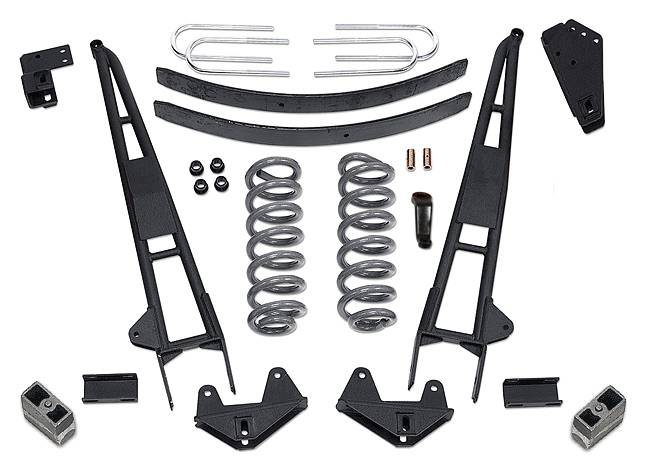 - Includes: 2) Coil Springs (EZ-Ride), 2) Axle Pivot Brackets (w/cam-bolts), 2) Extended Radius Arms, 1) Pitman Arm, 2) Radius Arm Brackets, 2) Front Sway Bar Drop Brackets, 1) Front and Rear Brake Line Extension Kit , 4) Rear U-bolts, 2) Rear Add-a-Leafs , 2) 4 Inch Rear Cast Iron Lift Blocks (replaces factory blocks) 1) Hardware Bag