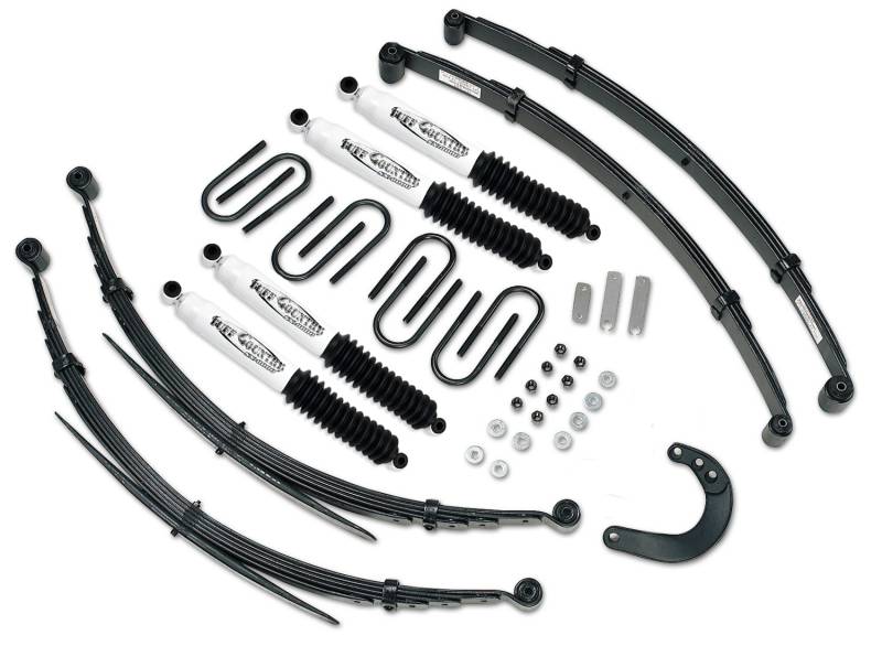 - Includes: 2) EZ-Ride front leaf springs, 2) EZ-Ride rear leaf springs, 1) Drop steering arm, 4) Rear u-bolts, 4) Front u-bolts, 1) Transfer case drop kit, 1) Front sway bar drop kit, 1) Brake line extension kit, 2) Hardware bag, 4) Front leaf spring eye bolts, 4) Rear leaf spring eye bolts, 4) SX8000 Shocks