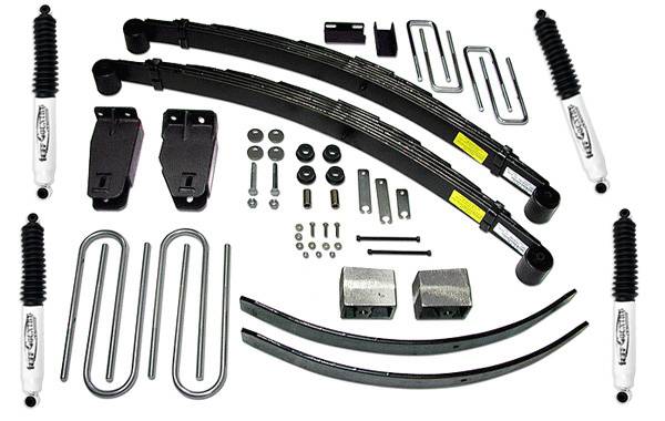 - Includes: 2) Front leaf springs (w/poly bushings), 2) Axle Pivot Brackets (w/cam bolts), 2) 4 inch Cast Iron Rear Blocks (replaces factory blocks), 2) Front Sway Bar Drop Brackets, 4) Front U-bolts, 4) Rear U-bolts, 2) Front Brake Line Extension Brackets, 1) Rear Brake Line Extension Bracket, 1) Hardware Bag, 4) Poly Shackle Busings, 4) SX8000 Shocks