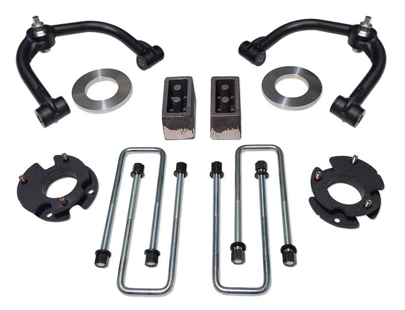 - Includes: 2) Front upper coil spacers, 2) Uni-Ball Upper Control Arms, 2) Pre-load spacers, 2) 3 inch cast iron blocks, 4) Extended rear u-bolts, 2) Hardware bags