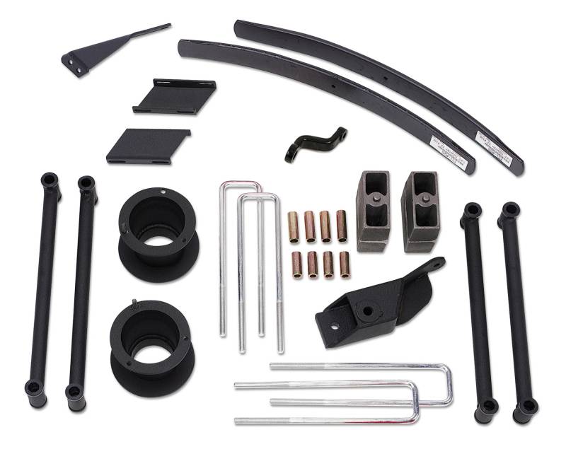 - Includes: 2) 4.5 Inch Upper coil spring tower brackets, 2) Upper control arms, 2) Lower control arms, 1) track bar bracket, 2) sway bar drop brackets, 1) Track bar support bracket, 2) Rear add-a-leafs, 2) 5.5 inch rear lift blocks (replaces factory blocks), 4) U-bolts, 1) Pitman arm and required hardware