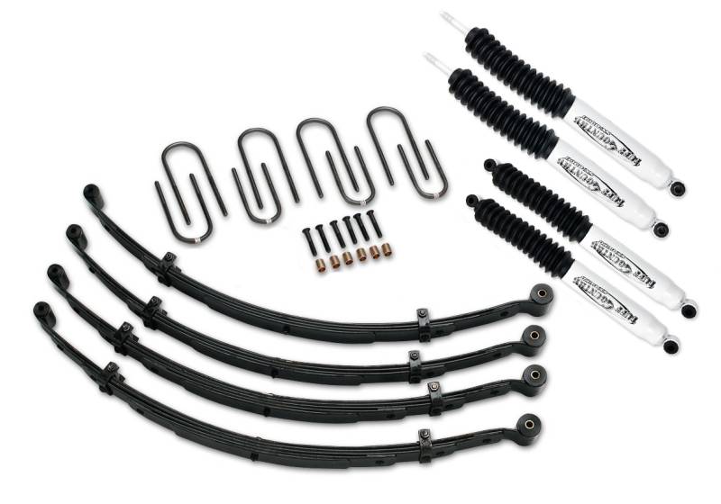 - Includes: 2) Front EZ-Ride leaf springs, 2) Rear EZ-Ride leaf springs, 1) Transfer Cases Drop Kit, 4) Rear U-bolts, 4) Front U-bolts, 1) Hardware Bag, 4) SX8000 Shocks