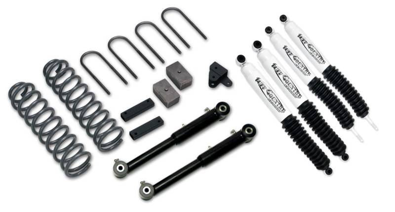 - Includes: 2) Coil Springs, 2) EZ-Flex Lower Control Arms, 1) Track Bar Bracket, 1) Transfer Cases Drop Kit, 1) Brakeline Relocating Kit, 4) U-bolts, 2) 3 Inch Lift Blocks, 1) Hardware Bag, 4) SX8000 Shocks
