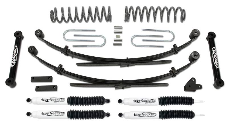 This Tuff Country Cherokee lift kits includes EZ-Ride coil springs for a comfortable ride without sacrificing off-road performance. New extended lowering control arms and a track bar relocating bracket are included to maintain proper alignment. A transfer case drop kit is used to help eliminate vibrations. New replacement rear leaf springs replace tired or sagging stock leaf springs.