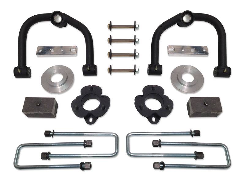- Includes: 2) Upper control ams, 2) Upper strut spacers, 2) Pre-load spacers, 2) Sway bar drop brackets, 4) Cam bolts, 2) Rear lift blocks, 4) Extended U-bolts, 1) Hardware bag