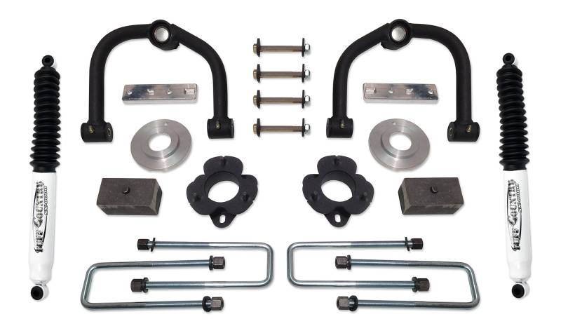 - Includes: 2) Upper control ams, 2) Upper strut spacers, 2) Pre-load spacers, 2) Sway bar drop brackets, 4) Cam bolts, 2) Rear lift blocks, 4) Extended U-bolts, 1) Hardware bag, 2) Rear SX8000 Shocks