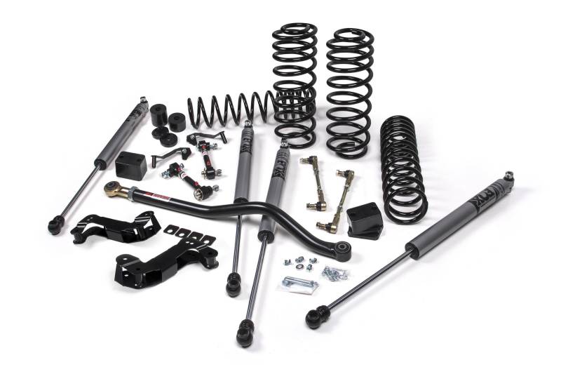 A step up from JKS J-Venture systems, J-Kontrol is a true bolt-on system that adds in front control arm correction brackets to flatten upper/lower control arm angles, plus a long list of upgraded components including JSPEC dual-rate coil springs, your selection of Jspec or Fox shocks, an adjustable front track bar and rear track bar bracket to correct axle positioning under vehicle, Quicker-Disconnect sway bar end links and front/rear Bump Stop Extensions.