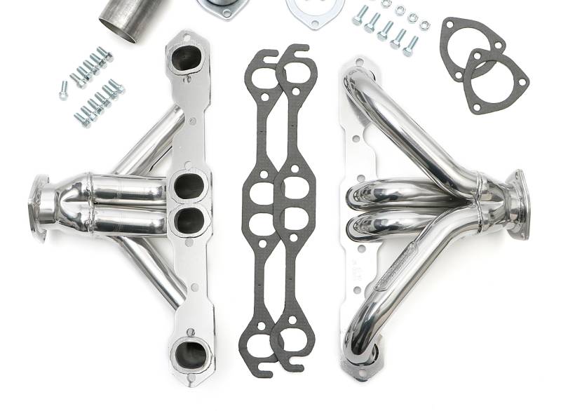 Silver 1-5/8 in. Block Hugger Headers For SB Chevy w/Angle-Plugs Handcrafted, Mild Steel Construction. Classic Block Hugger Style Is Perfect For Street Rods, and Cramped Custom Builds That Do Not Have Enough Clearance For Mid-Length or Long Tube Headers. Classic 3-Bolt Gasket-Style Header Collectors Includes All The Necessary Mounting Hardware, Gaskets and Reducers (exhaust adapters) Limted Lifetime Warranty On Construction, Five Year Warranty on Factory-Applied Header Coating!