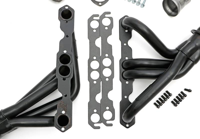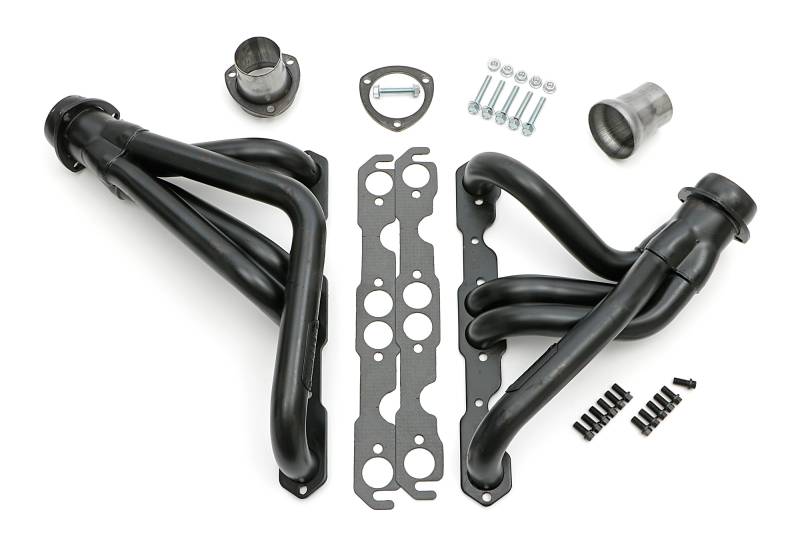 1-5/8 in. Mid-Length Headers For 1955-57 Chevy Tri-5 with 283-400 Handcrafted, Mild Steel Construction. The Mid-Length Tube Header Design Provides Significantly More Low and Mid-range Power than Cast Manifolds, and Provide Better Ground Clearance And Component Compatibility Than Long Tube Headers. Ball & Socket Collector Design requires No Gasket, and Allows For More Exhaust System Misalignment than Old School, Gasket-Style Header Collectors Includes All The Necessary Mounting Hardware, Gaskets and Reducers (exhaust adapters) Limted Lifetime Warranty On Construction, Five Year Warranty on Factory-Applied Header Coating!
