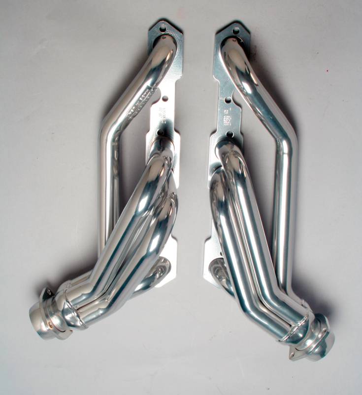 These polished-silver ceramic-coated, MID-LENGTH TUBE headers are uniquely designed to provide additional spark plug clearance when installed on a Small Block Chevy 283-400 (Gen 1) fitted with Angle Plug heads ( GM L98 aluminum heads, or equivalent design) into 1982-2004 Chevy S10/Blazer, GMC S15/Jimmy 2WD trucks. Fits both manual and automatic transmission trucks. The smooth 1-1/2 in. tube design provides ample exhaust flow to let your transplanted 283-400 SB Chevy engine breathe easy, and produce additional horsepower and torque over factory manifolds.