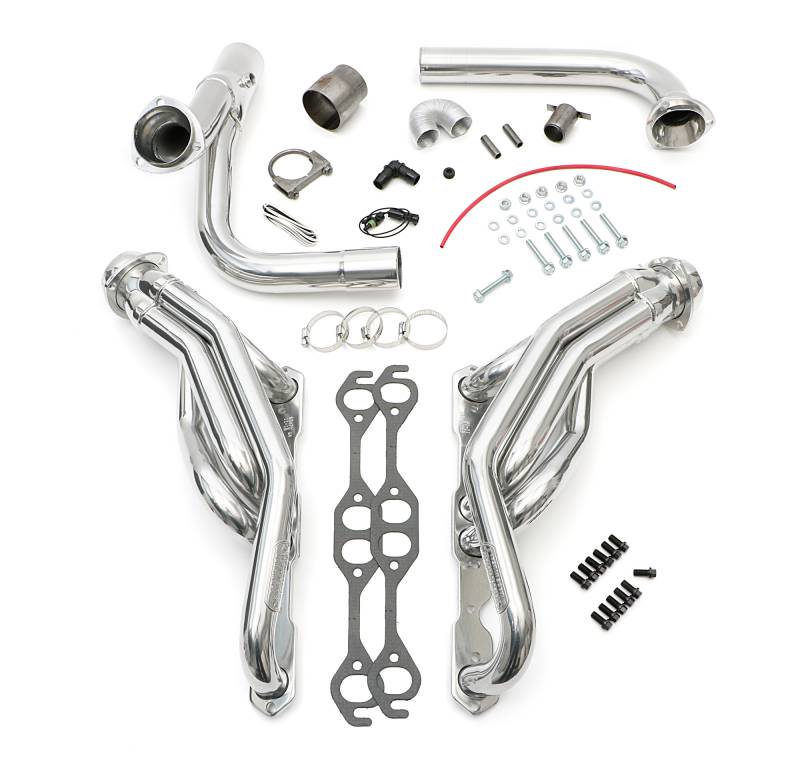SILVER MID-LENGTH E.O. HEADERS, 88-98 1/2-3/4 TON GM TRUCKS 5.0-5.7L Specially Designed To Provide Additional Clearance For Larger, Close-Ratio (Quick Ratio) Steering Boxes The Mild Steel, Mid-Length Tube Header Design Provides Significantly More Low and Mid-range Power than Cast Manifolds, and Provide Better Ground Clearance And Component Compatibility Than Long Tube Headers. Ball & Socket Collector Design requires No Gasket, and Allows For More Exhaust System Misalignment than Old School, Gasket-Style Header Collectors Includes All The Necessary Mounting Hardware, Gaskets and Reducers (exhaust adapters) Limted Lifetime Warranty On Construction, Five Year Warranty on Factory-Applied Header Coating!