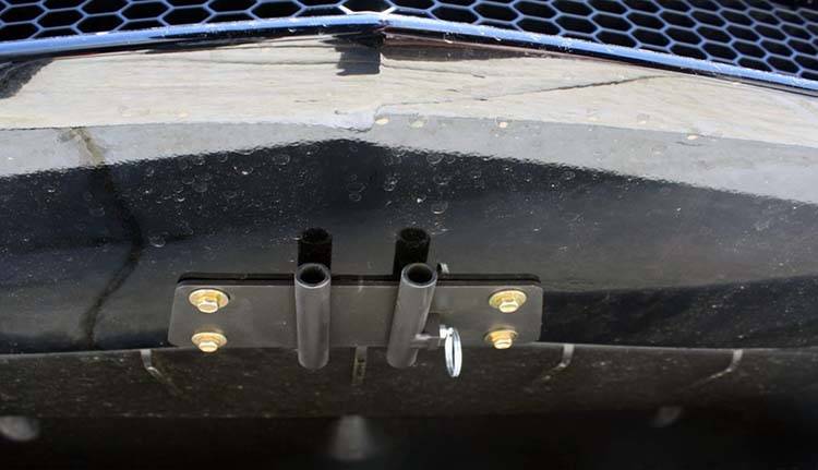 For 2011-2014 Super Bee/ SRT8 This bracket fits the 2011-2014 Dodge Charger Super Bee and SRT 8 models. Constructed of 5052 and 6061 aluminum, welded and anodized black, this bracket is built to last. All parts required for installation included, however, tools are required. Installation requires 2 holes to be drilled underneath the vehicle on the under carriage. These holes are not visible and do not detract from the look of the vehicle. Made in USA. Made of lightweight aluminum 2-piece system consisting of a front plate and a base plate Removal of the front plate requires only the pull of a spring loaded pull pin Made to be used with our GoPro camera mount Remaining base plate is virtually undetectable when front plate is removed