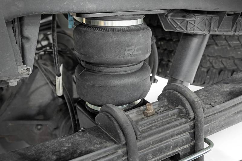 Ideal Leveling: Is your truck your workhorse? The main attraction of a pickup is the ability to haul and tow as needed. However, due to the weight in the bed or the condition of the rear leaf springs, your vehicle may become un-level under load. At Rough Country, we've designed a solution to eliminate these concerns. Introducing Rough Country's Rear Air Spring Kit.Heavy-Duty Construction: Rough Country's Rear Air Spring Kit includes two high-quality, double convoluted air bags, reinforced with durable powder-coated steel brackets and DOT-approved airlines. Whether you're towing a trailer or hauling heavy loads, this kit helps ensure your vehicle remains level, alleviating the strain on your trailer's tongue weight. The kit features 1/4" push-to-connect air fittings for easy installation, along with all necessary bracketry for a secure fit. Rough Country's Air Spring Kit supports up to 5,000 lbs of load, minimizing sway and preventing bottoming out while braking and steering. Easy Installation: Quick and simple setup for immediate use. Rough Country's kit can be installed at home with standard tools in just 5-6 hours, ensuring minimal downtime and fast, hassle-free installation.Onboard Air Compressor and Wireless Controller: For added convenience, Rough Country offers an optional onboard air compressor and wireless controller to easily adjust your air spring kit on the go. Control air pressure at the push of a button from the comfort of your vehicle.Reliable Warranty Coverage: Rough Country's Rear Air Spring Kit includes a limited lifetime warranty on the air springs and a two-year replacement warranty on the compressor, offering lasting protection against manufacturer defects. This industry-leading coverage ensures confidence in both quality and durability, so you can count on Rough Country to keep your truck performing at its best.