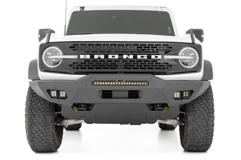 Add an Aggressive Style. Looking to add some attitude to your Bronco? Check out our Rough Country Front Bumper. This bumper will transform the appearance of your vehicle and protect your lights and engine from potential damage. Manufactured to be a perfect fit for your Bronco and provide maximum ground clearance, our bumper is designed to overlap the factory grille shell for looks and light bar fitment. Since it fits Rough Country's 20" light bars, with an option to add additional cube lighting on the side, you can upgrade your visibility at night and give your vehicle a touch of style.\ Modular Design. Rough Country’s High Clearance Bumper Kit is modular, letting you pick and choose the options you prefer. Spanning the line of our high-quality black series LED light bars and LED cube lights, YOU can decide the combination that best suits your needs! Boasting an impressive 14,400 lumens of combined lighting power you're sure to see the trails on your next outing. Each bumper features high clearance full wings that provide additional protection when tackling the trails!\ Installation. Requiring minor splicing, an estimated timeframe of 3-4 hours is suggested to complete the installation process. With the included step-by-step instructions this high-quality unit can be assembled and installed at home!\ Limited Lifetime Replacement Warranty. Rough Country’s High Clearance Bumper Kit is backed with a limited lifetime replacement warranty towards manufacturer defects. As such, the product is protected from structural and workmanship damage after the date of purchase. With our industry-leading warranty give yourself peace of mind when using Rough Country's Suspension products!