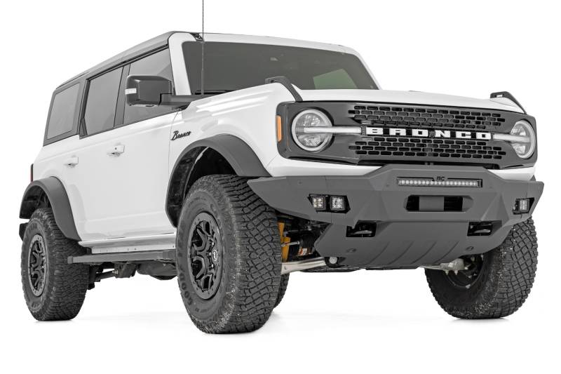 Add an Aggressive Style. Looking to add some attitude to your Bronco? Check out our Rough Country Front Bumper. This bumper will transform the appearance of your vehicle and protect your lights and engine from potential damage. Manufactured to be a perfect fit for your Bronco and provide maximum ground clearance, our bumper is designed to overlap the factory grille shell for looks and light bar fitment. Since it fits Rough Country's 20" light bars, with an option to add additional cube lighting on the side, you can upgrade your visibility at night and give your vehicle a touch of style.\ Modular Design. Rough Country's High Clearance Bumper Kit is modular, letting you pick and choose the options you prefer. Spanning the line of our high-quality black series LED light bars and LED cube lights, YOU can decide the combination that best suits your needs! Boasting an impressive 14,400 lumens of combined lighting power you're sure to see the trails on your next outing. Each bumper features high clearance full wings that provide additional protection when tackling the trails!\ Installation. Requiring minor splicing, an estimated timeframe of 3-4 hours is suggested to complete the installation process. With the included step-by-step instructions this high-quality unit can be assembled and installed at home!\ Limited Lifetime Replacement Warranty. Rough Country's High Clearance Bumper Kit is backed with a limited lifetime replacement warranty towards manufacturer defects. As such, the product is protected from structural and workmanship damage after the date of purchase. With our industry-leading warranty give yourself peace of mind when using Rough Country's Suspension products!