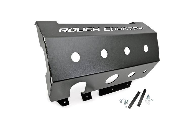 So, you've beefed up the outside of your Jeep JK, but what about the underside?Protect your JK's Muffler from off-road hazards with Rough Country's Muffler Skid Plate. This durable, 3/16 plate steel skid helps to protect your muffler from rocks, debris and anything else you can throw at it! The Jeep JK's exposed muffler is a vulnerable weak-spot when rock crawling or traversing uneven terrain. Fortify this area with a layer of plate steel protection and gain incredible peace of mind on your next trip out on the trails!This easy upgrade looks great, too, featuring a laser-cut Rough Country logo with anangled design and port holes for proper airflow and heat dissipation. With a 100% bolt-on installation procedure, this upgrade is easy to install as well, and features Rough Country's Limited Lifetime Warranty.