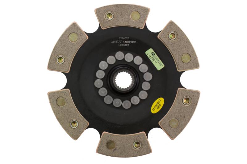 ACT 6 Pad Rigid Race Clutch Disc 6214025 is a 6-pad rigid race disc made with high quality ceramic friction materials. The disc engagement is harsher, but shifting is faster. The race disc features top grade rivets to securely fasten the part together. The rivet design and materials are carefully selected for maximum strength. The 6-pad rigid race disc is recommended for larger clutch sizes to absorb more heat and for smoother engagement. "Excellence in Performance", backed by the best one-year warranty in the industry!