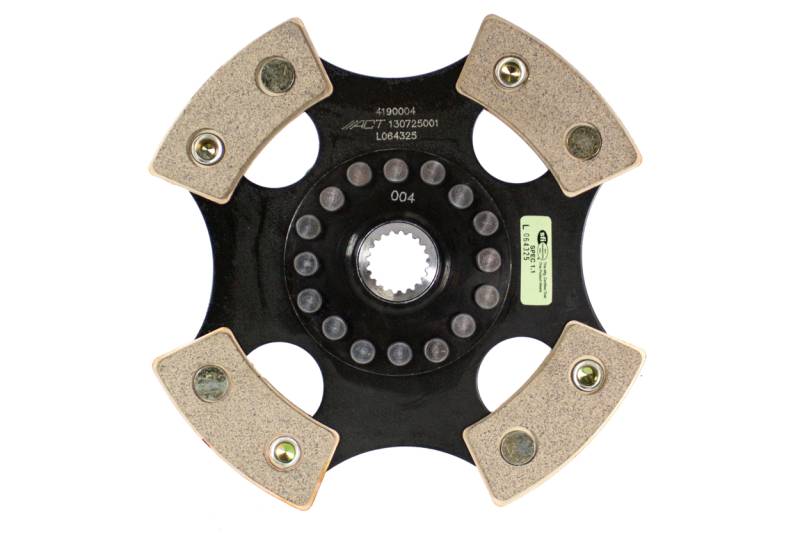 ACT 4 Pad Rigid Race Clutch Disc 4190004 is a 4-pad rigid race disc made with high quality, ceramic friction materials. The disc engagement is harsher, but shifting is faster. The race disc features top grade rivets to securely fasten the part together. The rivet design and materials are carefully selected for maximum strength. The 4-pad rigid race disc is well-suited for the smaller disc sizes in smaller engines. "Excellence in Performance", backed by the best one-year warranty in the industry!
